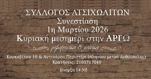 Την Κυριακή 1η Μαρτίου 2026 και ώρα 13.30΄ στο Κέντρο "Αργώ" (Καρκαβίτσα 16 και Αντιπάρου 2, Περιστέρι, τηλ. 2105717049, στάση μετρό Ανθούπολης), ο Σύλλογος Ατσιχωλιτών... - Συνέχεια...