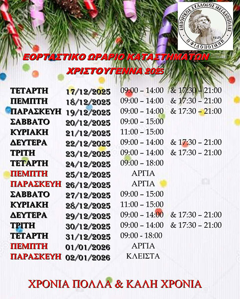 Ανακοινώθηκε το εορταστικό ωράριο των καταστημάτων της Μεγαλόπολης, βλ. απέναντι ανακοίνωση του Εμπορικού Συλλόγου «Ο Φιλοποίμην»…