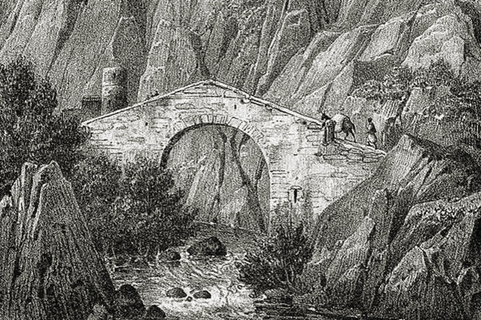 Για να πάρουμε το δρόμο που πάει στη Δημητσάνα έπρεπε να ανέβουμε τον ποταμό που οι αρχαίοι ονόμαζαν Γορτύνιο ή Λούσιο… Η μικρή κοιλάδα είναι μάλλον ακαλλιέργητη αλλά καθόλου δυσάρεστη καθότι εξαιρετικά δροσερή… Μετά από δίωρη πεζοπορία φτάσαμε στη γέφυρα της οποίας την άποψη βλέπουμε στον πίνακα. Σπασμένα κομμάτια από αρχαίες κολόνες βρίσκονται στην είσοδο και ένα από αυτά, αυτό που φαίνεται στα δεξιά, φέρει ένα απόσπασμα επιγραφής, δυο γραμμές όλες και όλες. Ένας μύλος και οι αποθήκες του, ιδιοκτησία του Κολοκοτρώνη, φαίνονται από πάνω. Το νερό του ποταμού κυλάει ταχύτατα στην αμμώδη κοίτη περνώντας ανάμεσα από βράχια που κόβονται απότομα. Το νερό το βρήκαμε εξαιρετικά κρύο, μια ιδιαιτερότητά του που ήταν γνωστή από τους αρχαίους χρόνους…
