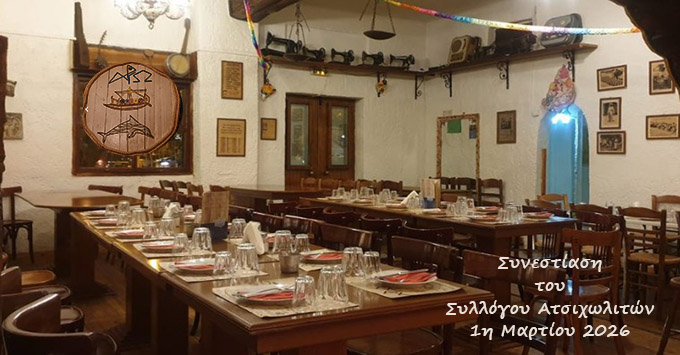 Την Κυριακή 1η Μαρτίου 2026 και ώρα 13.30΄ στο Κέντρο «Αργώ» (Καρκαβίτσα 16 και Αντιπάρου 2, Περιστέρι, τηλ. 2105717049, στάση μετρό Ανθούπολης), θα πραγματοποιήσει φέτος την ετήσια συνεστίαση και κοπή της πίτας του. Με χορό, δημοτικό και λαϊκό πρόγραμμα. Η τιμή συμμετοχής ορίζεται στα 30 ευρώ (περιλαμβάνεται το μενού και απεριόριστη ποσότητα κρασιού και αναψυκτικών). Για περισσότερες πληροφορίες επικοινωνήστε με το μέλος του Δ.Σ. κ. Άννα Μεργούπη, τηλ. 2108310539 και 6946630875. Θερμή παράκληση, για κρατήσεις θέσεων να επικοινωνήσετε το αργότερο έως 21 Φεβρουαρίου 2026.
